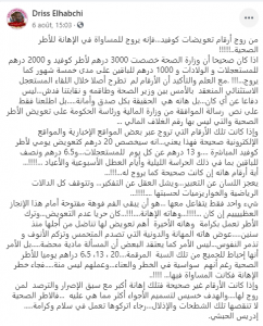 و كتب الحبشي على صفحته الفايسبوكية يقول : ” من روج أرقام تعويضات كوفيد…فإنه يروج للمساواة في الإهانة للأطر الصحية..!!!!! اذا كان صحيحا أن وزارة الصحة خصصت 3000 درهم لأطر كوفيد و 2000 درهم للمستعجلات و الولادات و 1000 درهم للباقين على مدى خمسة شهور كما يروج…!!! .مع العلم والتأكيد أن الأرقام لم تطرح أصلا خلال اللقاء المستعجل الاستثنائي المنعقد بالأمس بين وزير الصحة وطاقمه و نقابتنا فدش…ليس دفاعا عن أي كان…بل هاته هي الحقيقة بكل صدق وأمانة…..بل اطلعنا فقط على نص رسالة الموافقة من وزارة المالية ورئاسة الحكومة على تعويض الأطر الصحية والتي ليس بها رقم الغلاف المالي”.